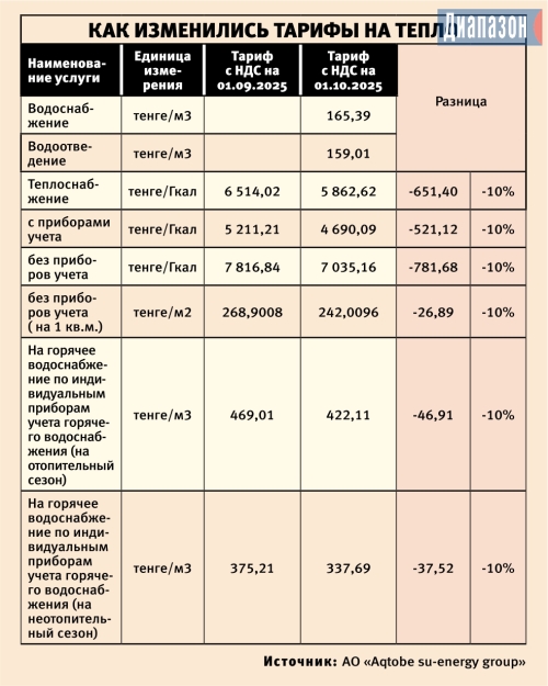 — 1 июля тариф на тепло повышали на 10%, в сентябре ещё на 4%. Теперь с октября он снижается на 20%. Зимой средний тариф для населения составлял 5 694.32 тенге за Гкал. теплоэнергии, с октября будет 5 211,23 тенге с учетом НДС. Также на 20% снижается и тариф на горячую воду. Вместо 469,01 тенге за кубометр потребители будут платить 375, 21 тенге, — разъяснила Асель Тажибаева, руководитель планово-экономического отдела в АО «Aqtobe su-energy group». Как разъяснили в АО «Aqtobe su-energy group», по приказу департамента Комитета по регулированию естественных монополий по Актюбинской области, с 1 октября на 20% снижены тарифы на теплоснабжение и горячую воду для физических лиц. Заметим, что касается тепла, тариф на него поднимали этим летом дважды — в июле и сентябре, поэтому в сравнении с прошлым отопительным сезоном платить за него все равно придётся больше. Но без снижения сумма была бы гораздо выше.