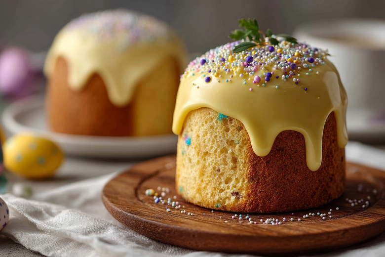 Сверните рулет, разрежьте вдоль, не дорезая до конца, затем скрутите и уложите в форму. Дайте подойти, выпекайте при 200°С 10 минут, затем снизьте до 180°С и пеките ещё 20–30 минут под фольгой. Украсьте белковой глазурью. Этот кулич остается мягким и ароматным несколько дней.