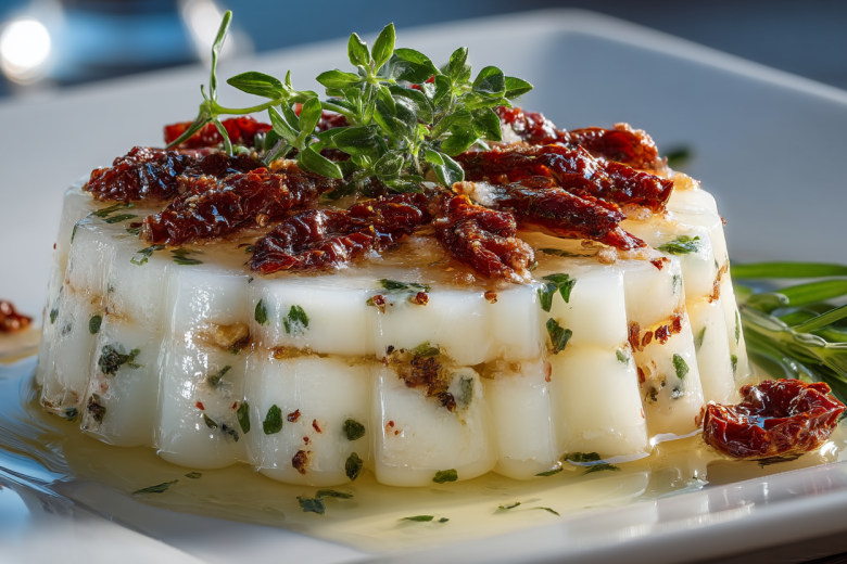 Кажется невероятным, что из простого йогурта, сметаны и моцареллы можно создать такую изысканную закуску. Желе приобретает нежную текстуру, а вкрапления сыра и томатов добавляют пикантности, превращая базовые ингредиенты в кулинарный акцент стола.